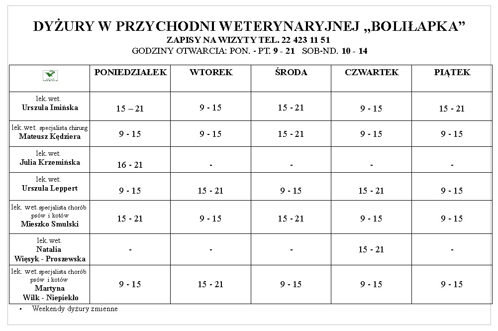 Zapisy na godziny mają charakter orientacyjny! - Podczas dyżurów w soboty ceny wizyt i usług są wyższe o 25% a w niedziele o 50%.